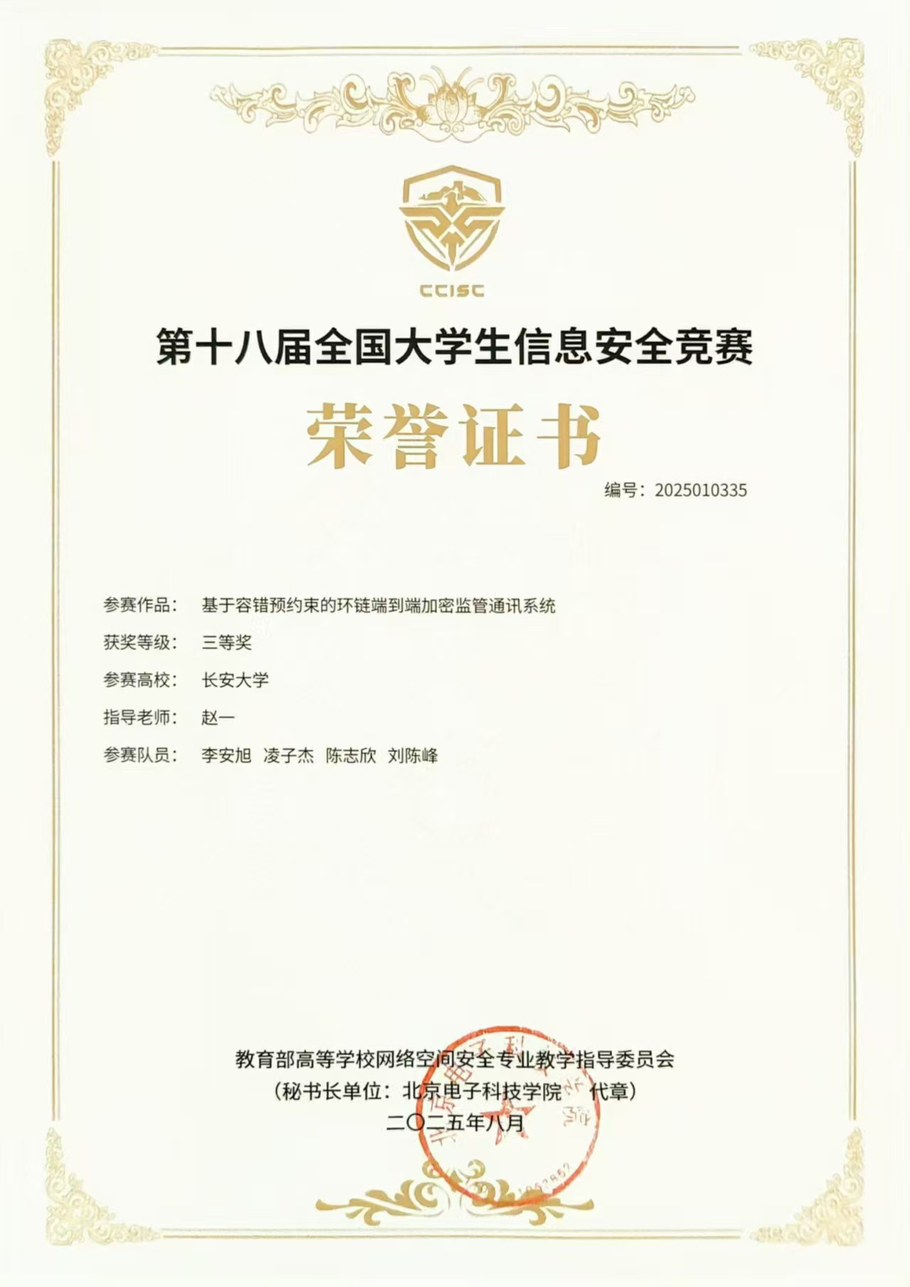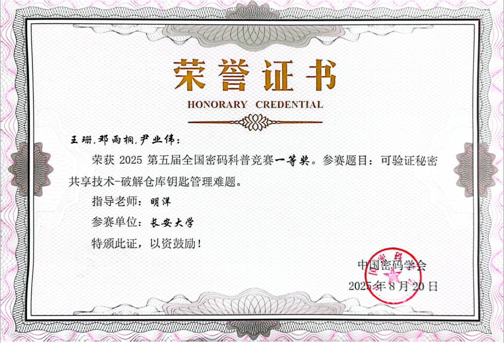 2025年8月14日,第五届全国密码科普竞赛决赛在河南新乡圆满落幕。由公司明洋教授指导,研究生王珊、邓雨桐、尹业伟共同制作的密码技术科普视频《可验证秘密共享技术—破解仓库钥匙管理难题》荣获本次竞赛一等奖。 本...