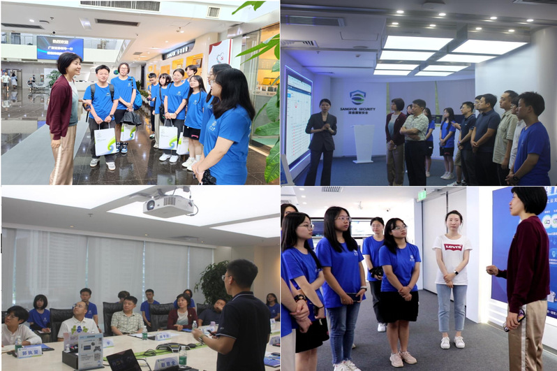 公司领导与实践团队一同前往深圳市深信服科技股份有限公司,聆听企业介绍、员工的介绍及分享以及校园招聘情况介绍。随后,大家一同参观深信服科技展厅。企业工作人员为大家展示深信服研发的一系列网络安全产品并演示网络安全管理界面,着重介绍产品的优势以及其解决的痛点。