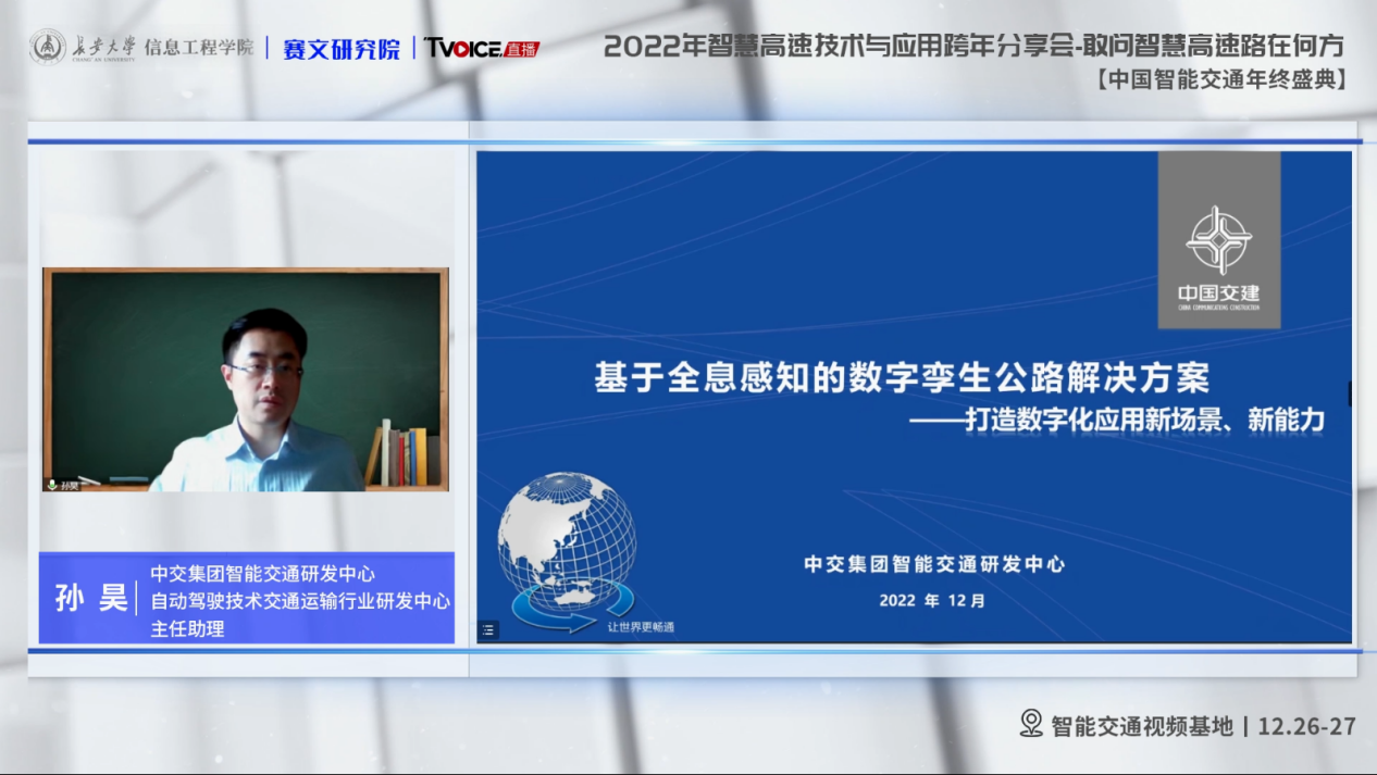 中交集团智能交通研发中心/自动驾驶技术交通运输行业研发中心主任助理孙昊以《基于全息感知的数字孪生公路解决方案》为主题,做了精彩的报告。报告回顾了在全息感知的数字孪生公路解决方案下,中交集团打造的新场景及新能力,以及相关科研成果转化为解决方案的具体路径。孙昊介绍了基于全息感知的数字孪生公路解决方案的研发背景、总体思路,以及它所形成的技术方案,最后介绍中交集团在实际项目中应用案例。