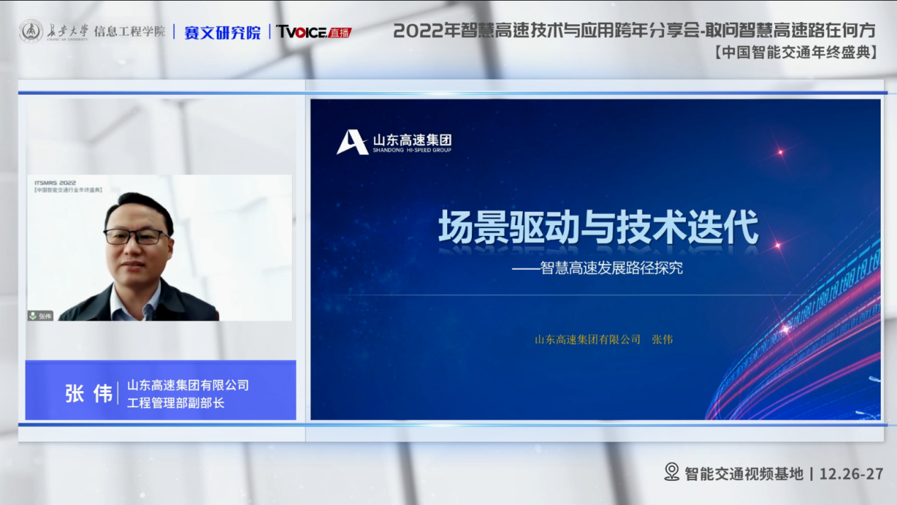 山东高速集团有限公司工程管理部副部长张伟在《场景驱动与技术迭代—智慧高速发展路径探究》报告中指出当前智慧高速还处于智慧场景的探索应用阶段,他提出了智慧高速的发展路径,即智慧高速未来发展路径会朝着场景驱动和技术迭代两个维度展开,接着以山东智慧高速建设为例,详细介绍了智慧高速的建设内容、目标,然后就智慧高速建设和智能管控体系构建过程中产生的问题进行分析,提供了解决思路与方案,最后针对未来智慧高速发展建设提出了相关建议。