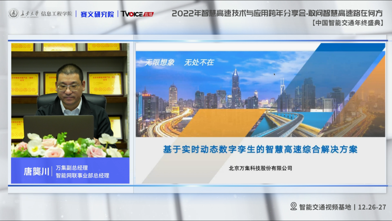 万集科技智能网联智慧高速业务总经理唐龑川在《基于实时动态数字孪生的智慧高速综合解决方案》报告中,从智慧高速总体建设思路、智慧高速创新应用场景等多个角度切入,详细介绍了智慧高速产业发展的现状。