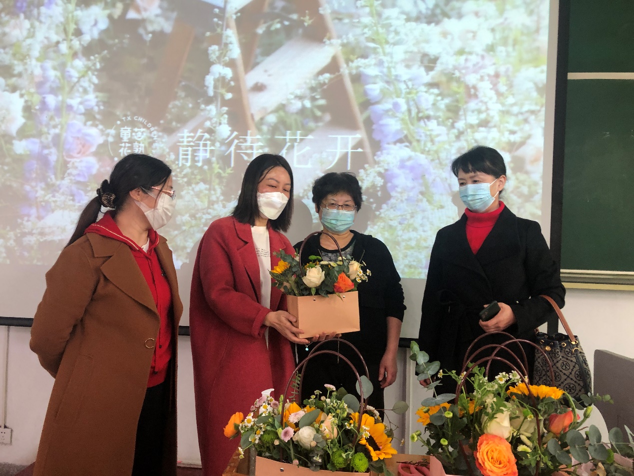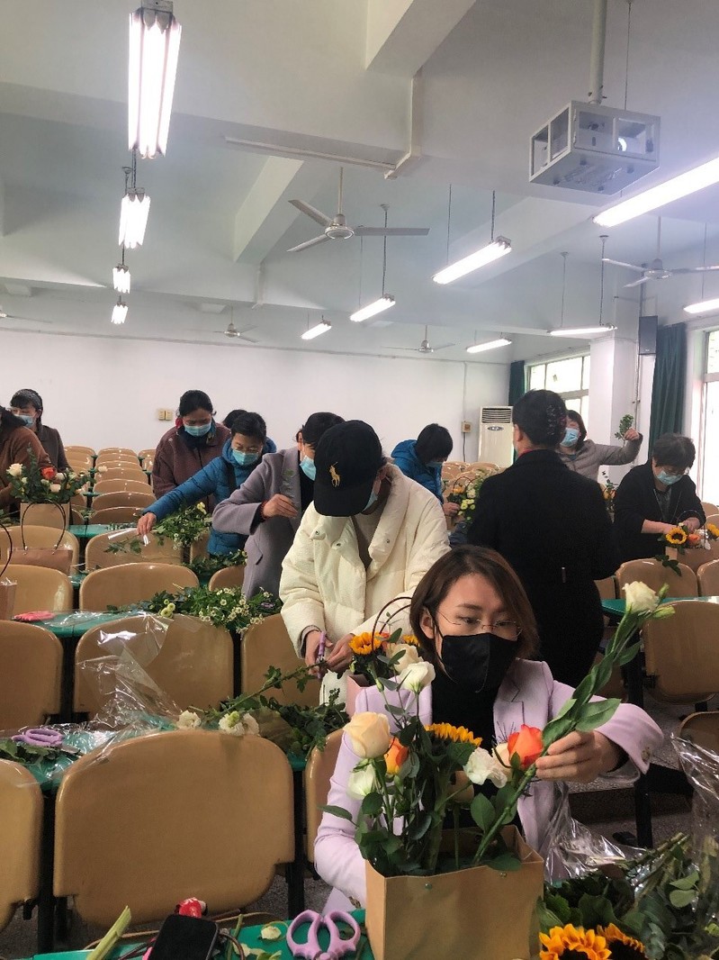 来自童芯花艺教育中心的高级讲师毛老师详细地介绍了基本花艺知识、花材及花语等内容,用精心准备的玫瑰、向日葵、小雏菊、尤加利叶和桔梗等花材做了插花现场演示,然后细心指导女教职工们完成精美、风格各异的插花作品。