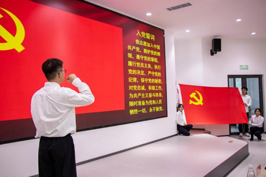 入党宣誓仪式上,在公司本科生第五党支部书记秦丰的带领下,全体党员面向党旗庄严宣誓。