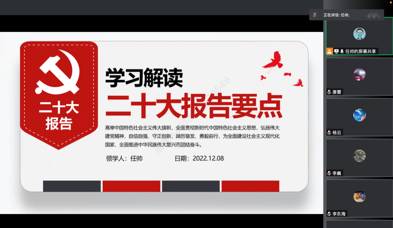 任帅带领大家学习了党的二十大报告原文,重点对报告第五分“实施科教兴国战略,强化现代化建设人才支撑,”进行了解读。党的二十大报告,通篇贯穿习近平新时代中国特色社会主义思想,描绘了全面建设社会主义现代化国家、实现第二个百年奋斗目标的宏伟蓝图,是我们党开启新时代新征程的政治宣言和行动纲领。