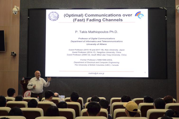 P.Takis Mathiopoulos教授讲述了无线传播环境下的移动衰落信道的概念,再针对衰落信道进行分类,图文并茂的展示讲述了长期衰落、短期衰落等类型的公式及特点。他指出衰落效应将会导致误码率和数据包错误率的增加。为解决该问题,在技术方面,他提出使用DPS双先导系统;在理论方面,P.Takis Mathiopoulos教授列出最佳非相干接收机的推导,并用图片和公式依次展示了发射器和接收器的结构,指出了最佳接收器的定义、参数以及推导过程。紧接着,他展示了状态空间图,眼图、以及硬件实现和相关测试图等,显示数字信号的传输质量,再对实验通过曲线图对比分析进行性能评估。