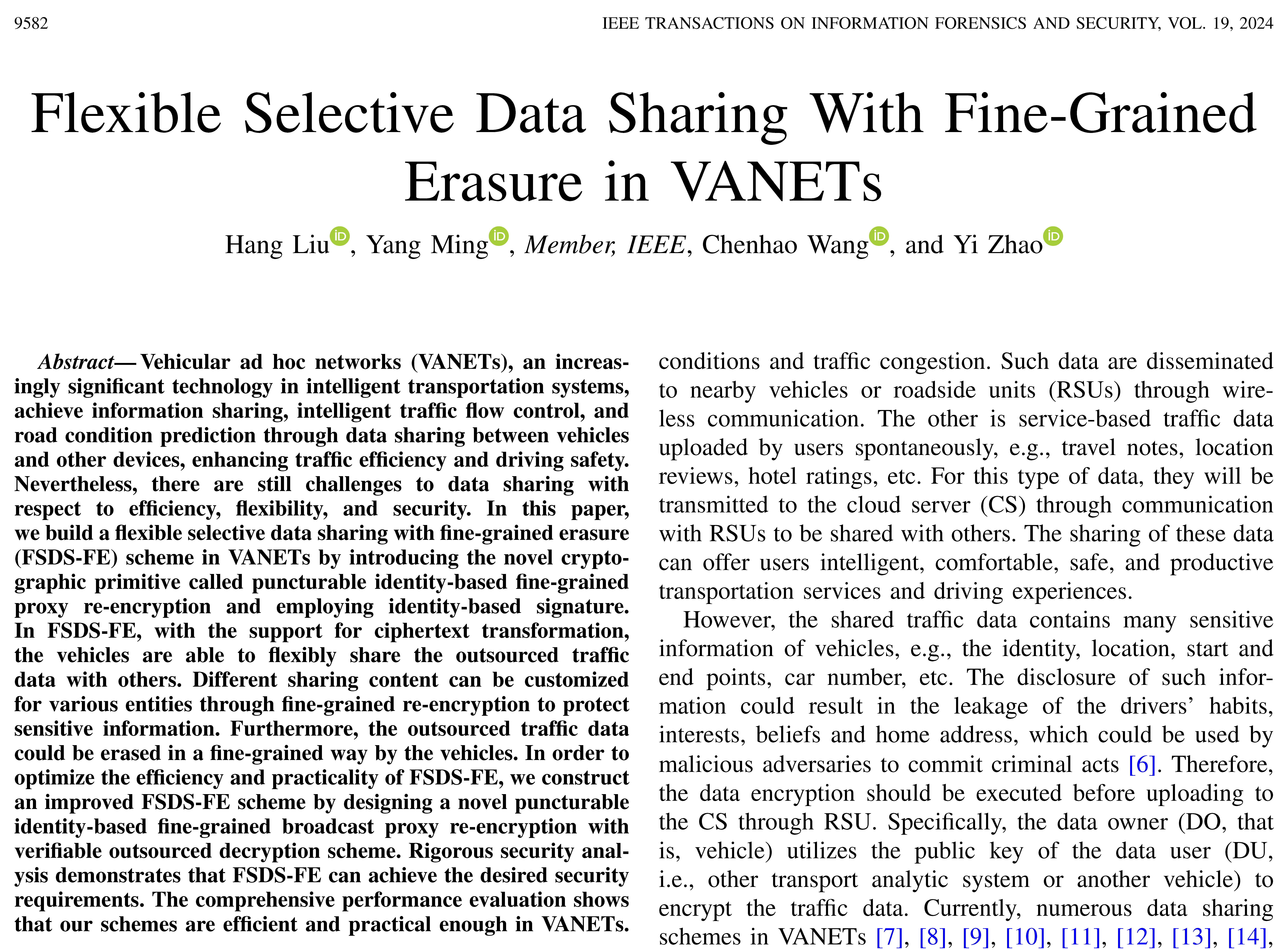 论文信息:Hang Liu, Yang Ming, Chenhao Wang, and Yi Zhao. Flexible selective data sharing with fine-grained erasure in VANETs. IEEE Transactions on Information Forensics and Security, 2024, 19: 9582-9597.