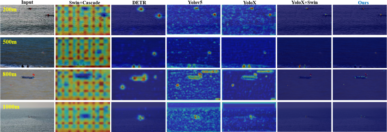 本文基于2022年3月中国厦门近岸实测数据构建了XM-10000基准数据集。超过50%的目标仅占原图实际面积的0.06%。消融实验及对比实验结果表明,所提出的算法拥有较高的检测精度及召回率,通过Tensorrt加速后满足实际应用并成功部署。