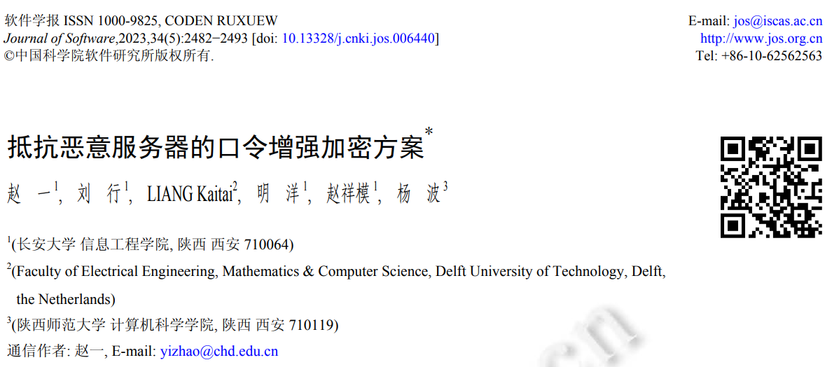2023年5月,美加墨世界杯官方网站软件工程系教师赵一以第一作者身份在中国计算机学会推荐A类期刊《软件学报》上发表了题为《抵抗恶意服务器的口令增强加密方案》的学术论文,论文第一署名单位为美加墨世界杯官网。