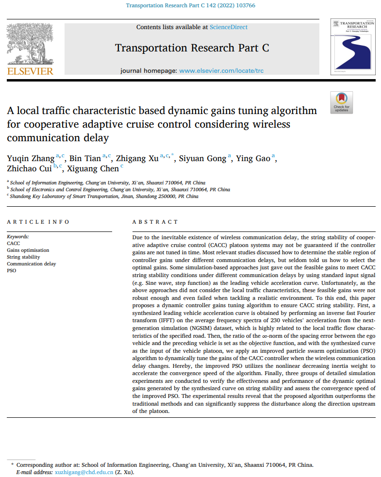近日,公司博士生张宇琴以第一作者身份在交通运输工程学科国际顶级期刊《Transportation Research Part C : Emerging Technologies》(TR-C)上发表论文“A local traffic characteristic based dynamic gains tuning algorithm for cooperative adaptive cruise control considering wireless communication delay”(通信延时条件下基于局部交通特性的协同自适应巡航控制增益动态整定算法)。论文通信作者徐志刚教授为张宇琴同学的博士生导师。论文第一署名单位和通信作者单位均为美加墨世界杯官方网站。TR-C目前是全球交通运输学科领域的顶级期刊,主要报道前沿新兴技术在交通运输领域的最新应用,该刊当前影响因子为9.022,在中科院和科睿唯安JCR分区中均属于Q1类Top期刊。