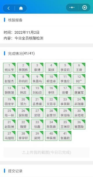 依托于“长大易班”微信小程序,员工在移动端上传核酸检测记录,可视化平台实时更新班级员工上传情况,辅导员电脑端实时统计完成情况,整个过程方便快捷。