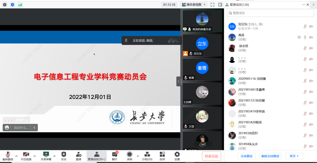 在当前疫情防控形势下,为提升老员工的实践动手能力,进一步加强电子信息工程本科专业学科竞赛指导宣传工作,电子信息工程系于2022年12月1日召开了电子信息工程专业员工线上学科竞赛动员会。电子信息工程系主任高涛老师、副主任刘立东老师、副主任秦菁老师以及该专业2020级、2021级全体本科生参加了动员会,高涛老师主持了会议。