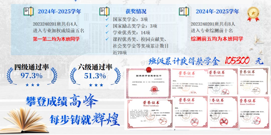 班级致力于构建优良学风,创新建立了“研讨组、科创队、帮扶队”三位一体的学习支持体系。“研讨组”聚焦专业难点,深度交流;“科创队”以竞赛为牵引,激发创新;“帮扶队”则落实一对一帮扶,累计开展学业辅导30余次,确保共同进步。在此机制下,班级学业成绩斐然:2024-2025学年,近80%的同学绩点达3.0以上,4人位列专业加权成绩前五,8人跻身综合测评前十。班级成员累计荣获国家奖学金3项、国家励志奖学金3项及其他各类奖学金70余项,获奖总额超过10万元。